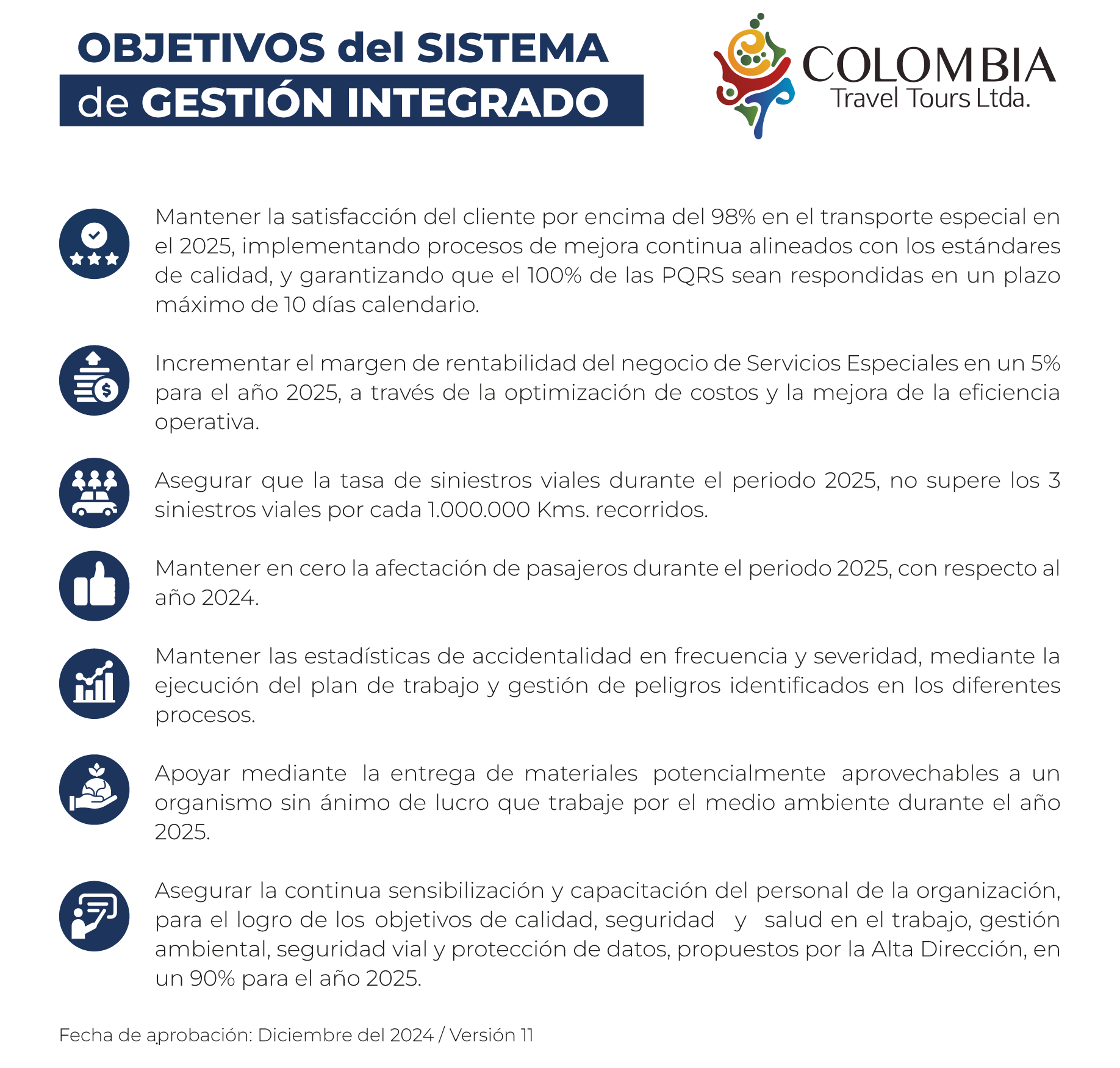 Somos una empresa colombiana que presta el servicio de Transporte terrestre especial de pasajeros y de turismo con cubrimiento nacional, orientada a brindar un servicio de calidad a nuestros usuarios y a cumplir con las necesidades de las partes interesadas, en donde la seguridad, la puntualidad, la comodidad y la tecnología se reflejan en un buen nombre en el mercado y en el sector empresarial, buscando los mejores resultados para nuestros accionistas, afiliados e inversionistas.