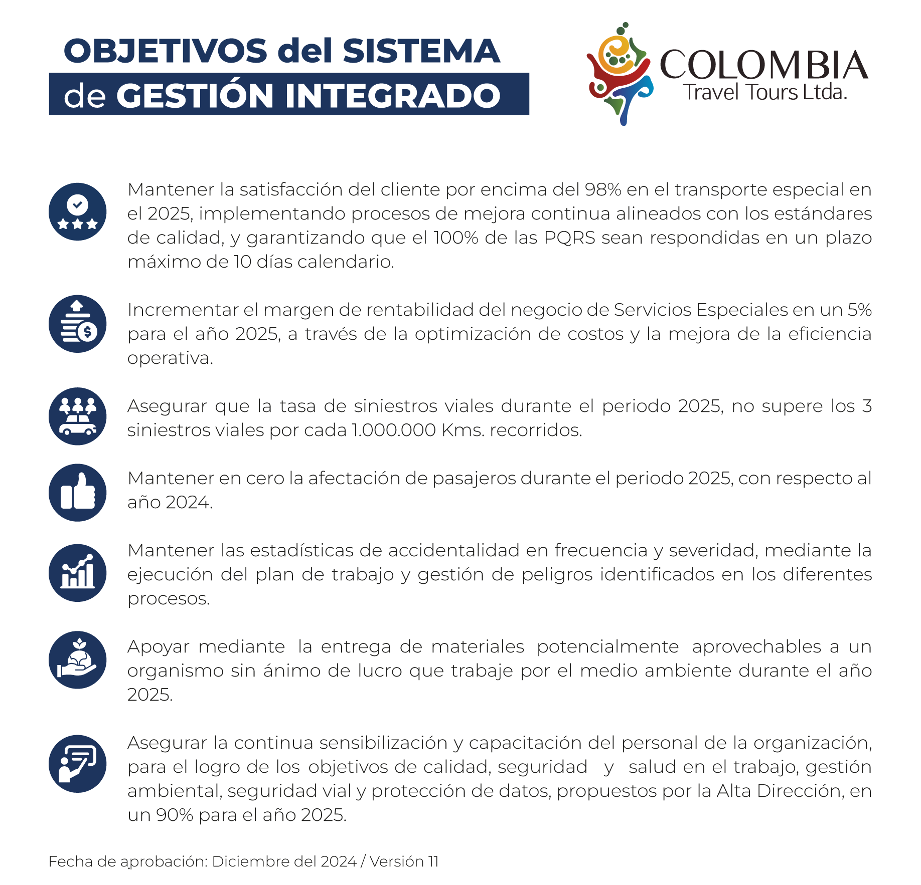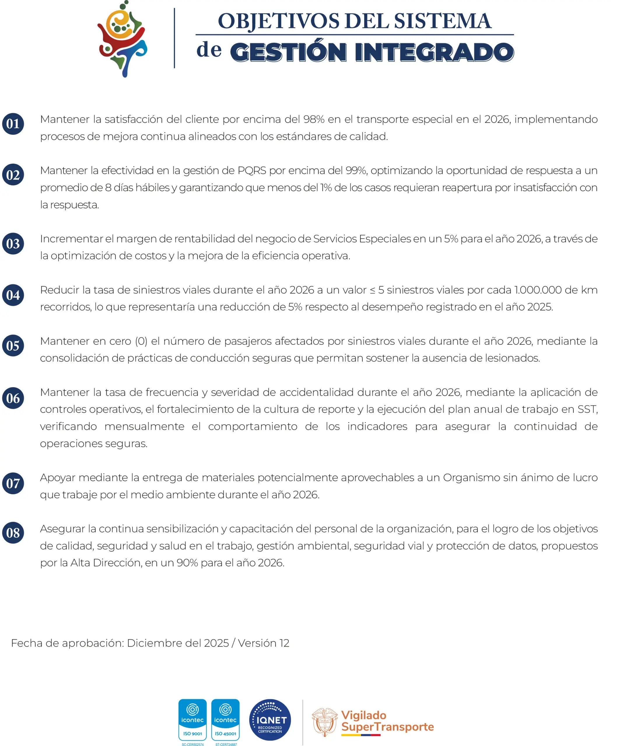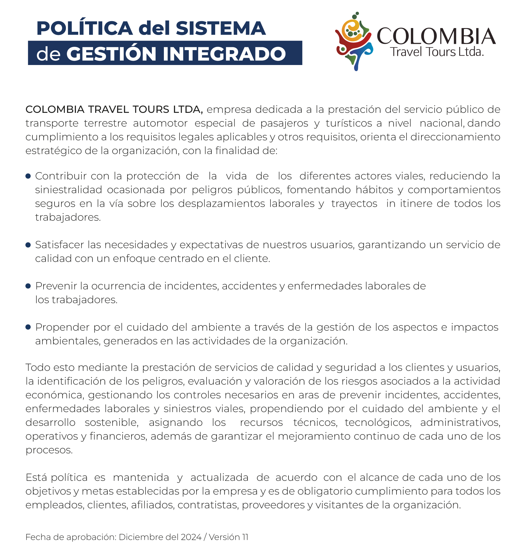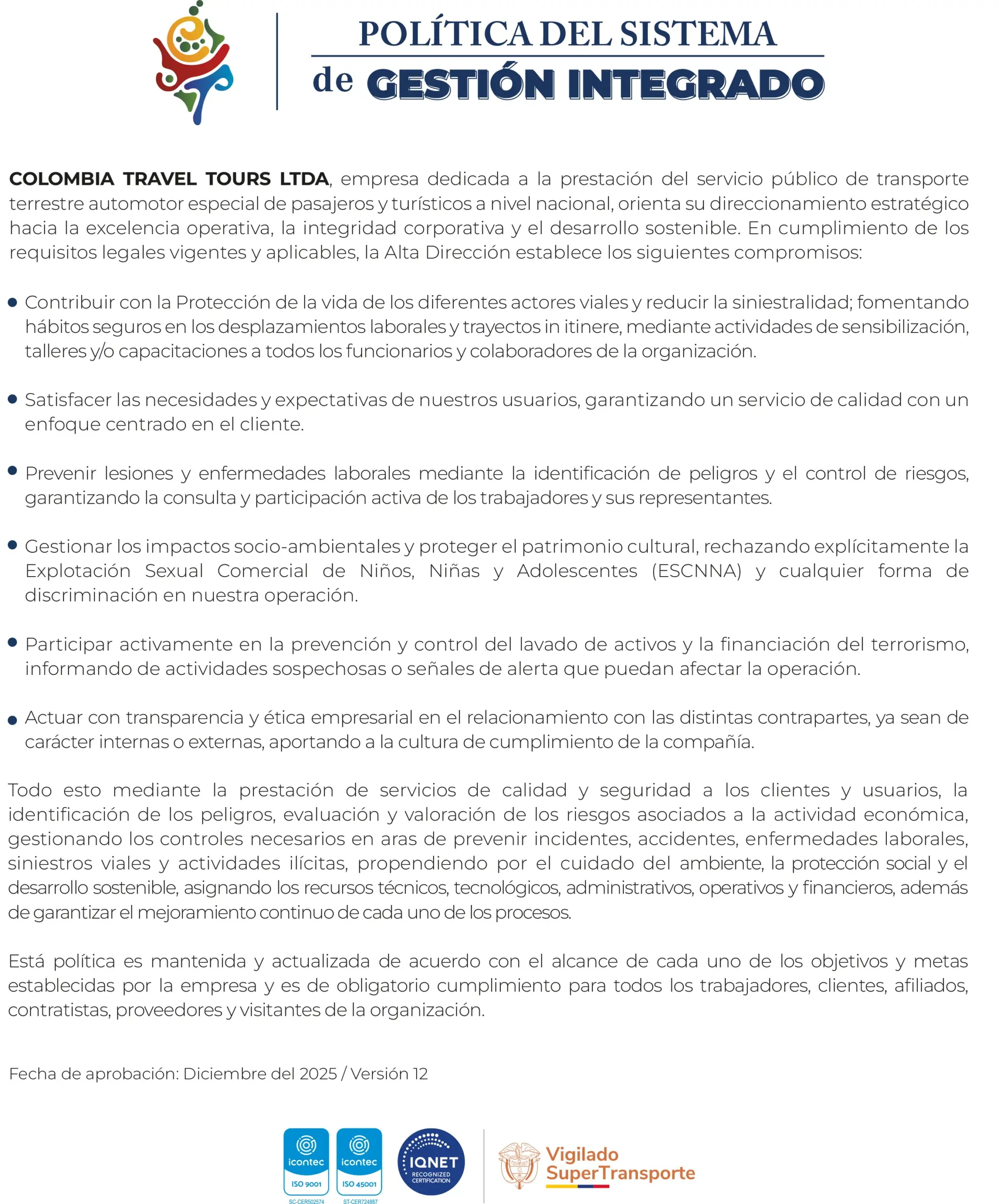 Somos una empresa colombiana que presta el servicio de Transporte terrestre especial de pasajeros y de turismo con cubrimiento nacional, orientada a brindar un servicio de calidad a nuestros usuarios y a cumplir con las necesidades de las partes interesadas, en donde la seguridad, la puntualidad, la comodidad y la tecnología se reflejan en un buen nombre en el mercado y en el sector empresarial, buscando los mejores resultados para nuestros accionistas, afiliados e inversionistas.